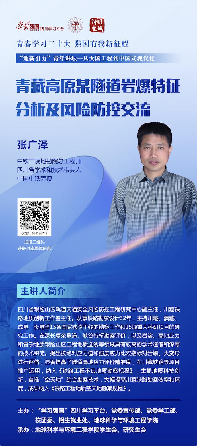 为学习宣传贯彻党的二十大精神,充分发挥学校轨道交通相关学科优势,引领广大青年学生将小我融入大我,以青春实践奉献祖国,在新时代新征程中奋勇争先建功立业,使青年一代在大国工程一线受教育、长才干、做贡献。地学学院在“学习强国”四川学习平台、党委宣传部、党委学工部、校团委以及招生就业处的支持下,邀请了大国工程一线以及思想政治教育与人文社科领域的专家、学者、教授为主讲嘉宾,通过“地新引力”青年讲坛的方式,为青年学生解惑授业、增知识、长才干,号召广大学生立志做有理想、敢担当、能吃苦、肯奋斗的新时代好青年。2023年5月4日,值此青年节之际,“地新引力”青年讲坛——“从大国工程看中国式现代化”开讲仪式暨专题一、专题二讲座即将开始,现就相关通知如下: