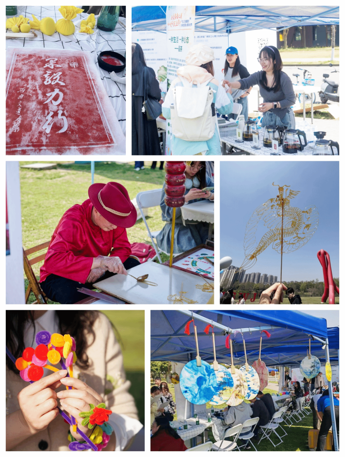 在户外互动体验区,茶饮与养生养心、蜡染制作与体验、拓印体验活动、漆扇制作、糖人、胶泥手工与书签、面具绘制体验、“春日簪花记”景泰蓝非遗手工发饰DIY、扭扭花制作、九连环等10个项目整齐排列。活动现场气氛热烈,同学们积极参与,每个摊位前都人头攒动,欢声笑语不断,特别是漆扇制作和转糖人摊位前更是排起了长队。同学们在动手实践中体验着传统工艺的精妙与乐趣。