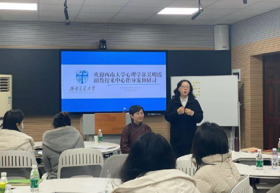 第一场案例研讨于12月16日在中心5329举行,本次研讨会特邀中国心理学会注册督导师、中国心理卫生协会精神分析专委会第五届常委、西南大学心理学部吴明霞副教授莅临现场进行专业指导,中心主任高雪梅、副主任冯缙、心理健康教育教研室教师及二级辅导站辅导员等20余人参加。