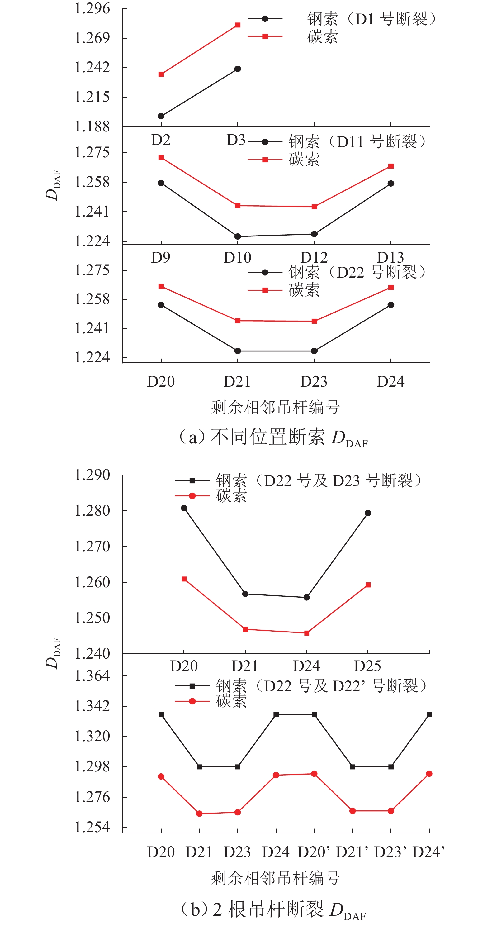 To study the effect of cable breakage on the impact response of concrete-filled steel tube arch bridges and the difference in safety factor requirements between carbon fiber reinforced polymer (CFRP) cables and steel cables, the dynamic response of a railway bridge under accidental cable breakage was analyzed. A spatial finite element model was established by ANSYS. The force characteristic variations of the residual structure of the arch bridge under five cable breakage conditions were studied based on the equivalent unloading method. The impact sensitivity of the structure after cable breakage was evaluated by dynamic amplification factor (